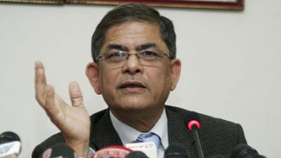 মির্জা ফখরুল বলেন, ‘আজ গণতন্ত্রের মোড়ক নিয়ে একেবারে ভয়াবহভাবে গণতন্ত্রকে ধ্বংস করা হচ্ছে। দেশনেত্রী বেগম খালেদা জিয়াকে অন্যায়ভাবে, বেআইনিভাবে কারাগারে আটক রাখা হয়েছে। এটা নজিরবিহীন। আমি বুঝতে পারি না, এখনও কিছু কিছু প্রতিষ্ঠানের প্রতি আস্থা আসে কীভাবে? সর্বোচ্চ আদালত হাইকোর্ট বেল দিয়েছে। সর্বোচ্চ আদালত স্টে করে রেখে কৌশলের অবলম্বন নিয়ে ছুটির পর দেয়া হবে, ছুটির পর করে করে মাসের পর মাস বেগম জিয়াকে কারারুদ্ধ করে রেখেছে, দেশনেত্রীকে কারারুদ্ধ করে রেখেছে। আমি জানি না এ কথা বললে, আদালত অবমাননা হবে কিনা? হলেও কিছু যায় আসে না। কারণ আমাদের এখন আর হারানোর কিছু নেই।’